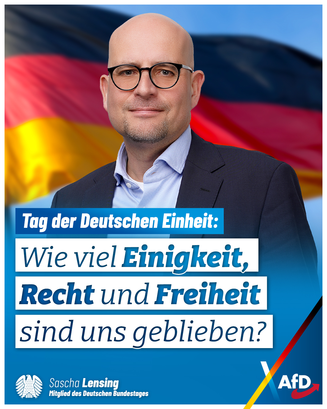 Der 3. Oktober erinnert uns an die Deutsche Wiedervereinigung und an die Kraft, die in einem geeinten Volk steckt. Heute ist es wieder Zeit, dass wir zusammenrücken statt uns spalten zu lassen. Egal welche Meinung man vertritt, ein offener und friedlicher Austausch statt Ausgrenzung oder Gewalt gegen Andersdenkende sollten wieder Normalität werden. An diesem Tag geht es nicht nur um Erinnerung, sondern auch um den Auftrag, die Zukunft unseres Landes stark und geeint zu gestalten.