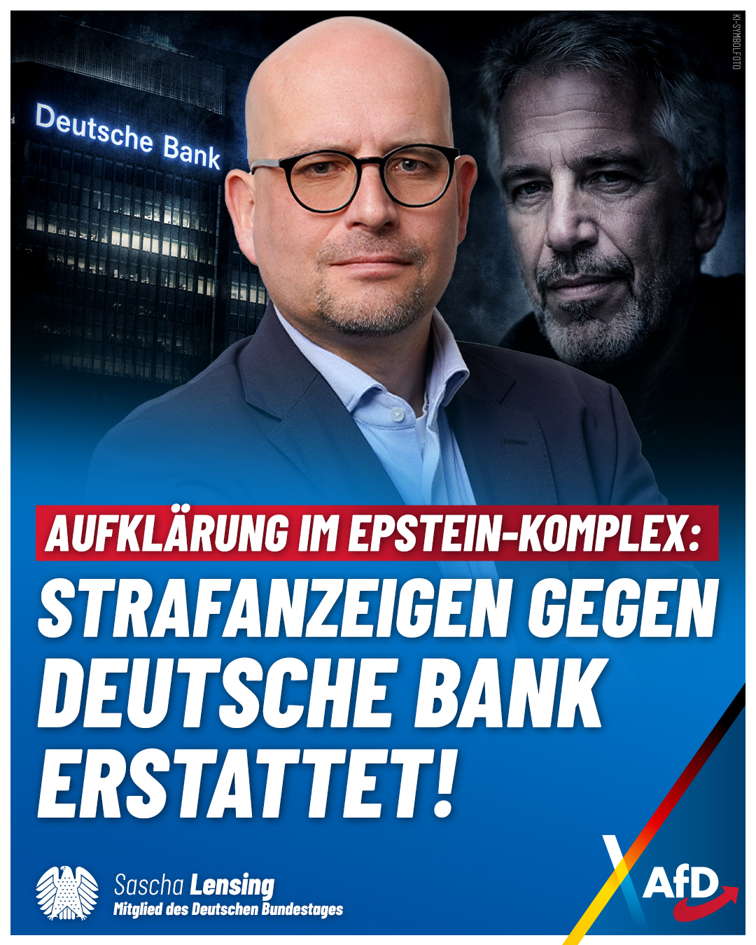 Der Bundestagsabgeordnete Sascha Lensing (AfD) hat bei der Staatsanwaltschaft Frankfurt amMain mehrere Strafanzeigen im Zusammenhang mit der früheren Geschäftsbeziehung zwischen derDeutschen Bank AG und dem US-amerikanischen Straftäter Jeffrey Epstein eingereicht....