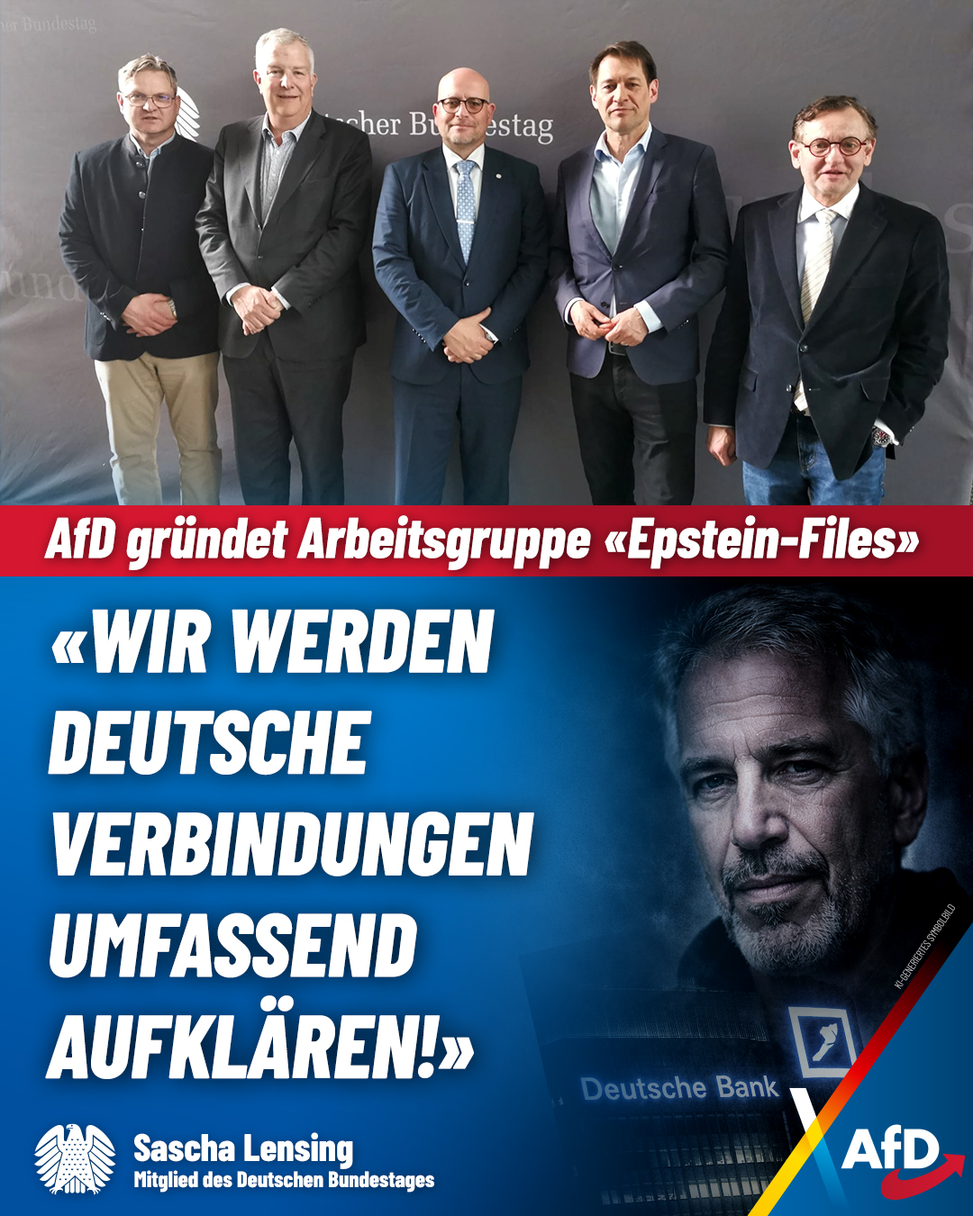 Die Arbeitsgruppe „Epstein-Files“ der AfD-Bundestagsfraktion hat am Montag, den 13.04.2026, ihre Arbeit aufgenommen. Ziel der Arbeitsgruppe ist die umfassende parlamentarische Aufklärung möglicher Deutschlandbezüge im Zusammenhang mit dem internationalen Epstein-Komplex.
